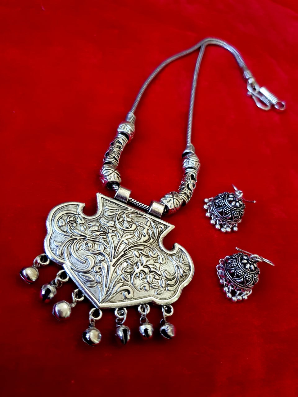 The German silver plating used when combined with the design gives a uniquely traditional look to the jewelry set.