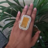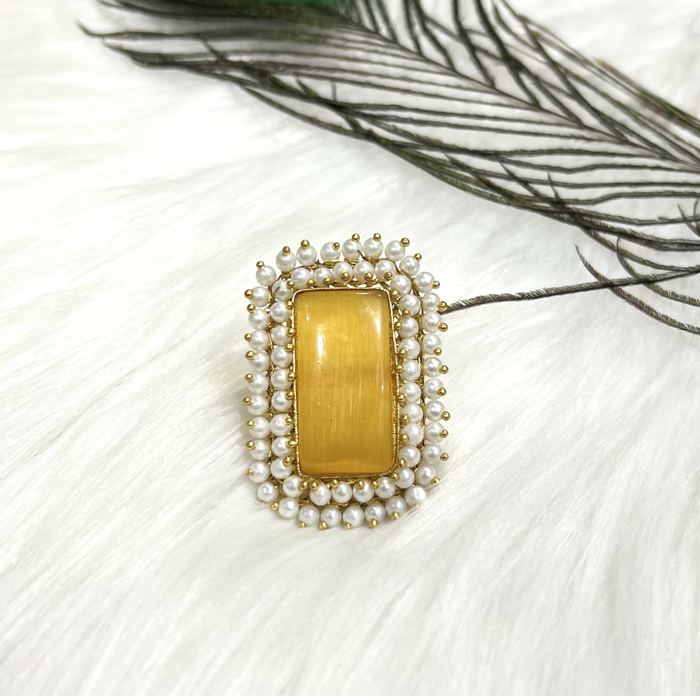 Designed with care, this ring beautifully merges the charm of Monalisa Stone with the timeless beauty of delicate pearl work, making it the perfect accessory for ethnic as well as contemporary outfits.